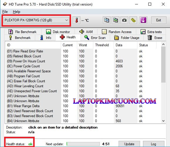 Như hình này thì dùng HD Tune Pro kiểm tra là ổ cứng SSD Plextor 128GB sức khỏe ok tốt.