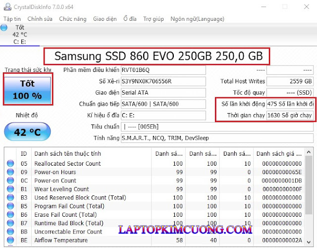 - Qua hình trên ta có thể kiểm tra model ổ cứng, số lần khởi động và thời gian chạy để biết ổ cứng xài lâu chưa, còn mới không, ít dùng hay dùng nhiều để có thông tin chính xác nhất.